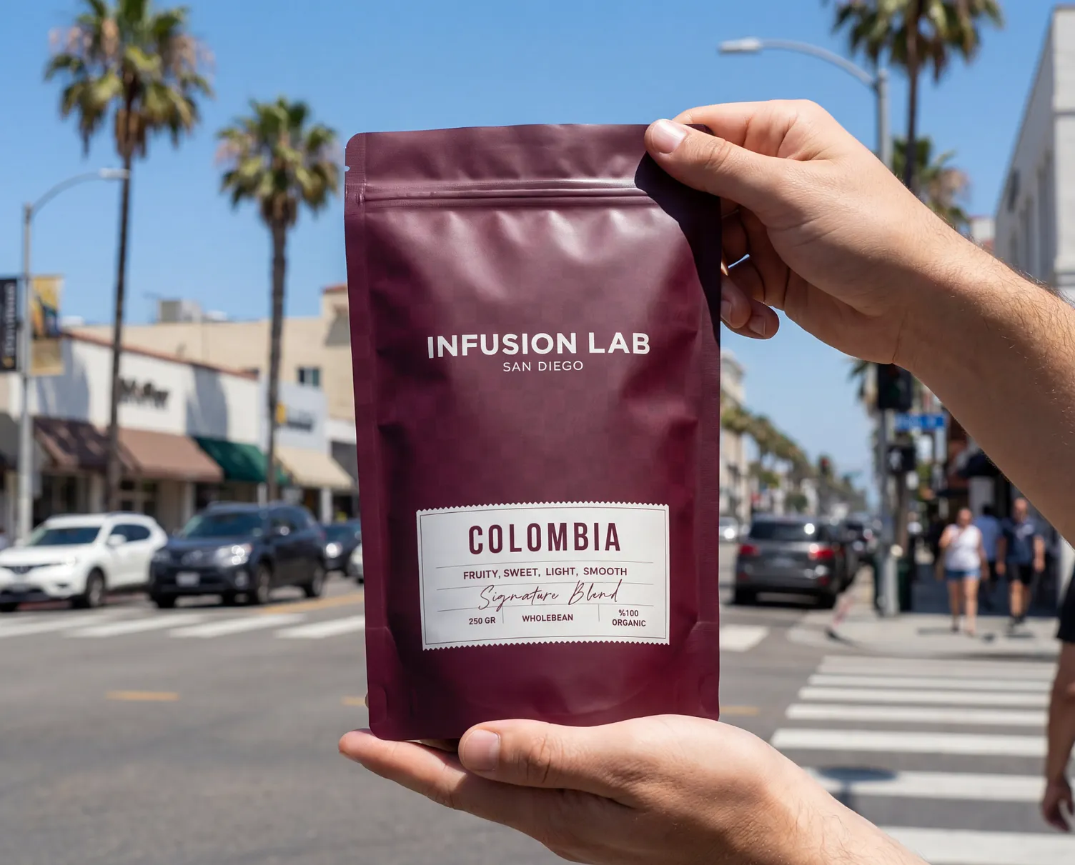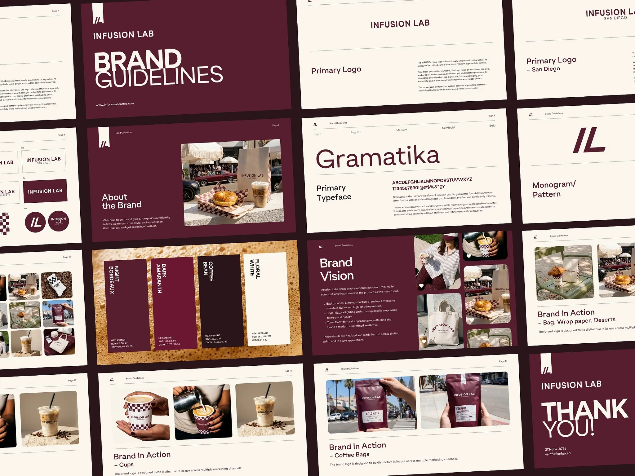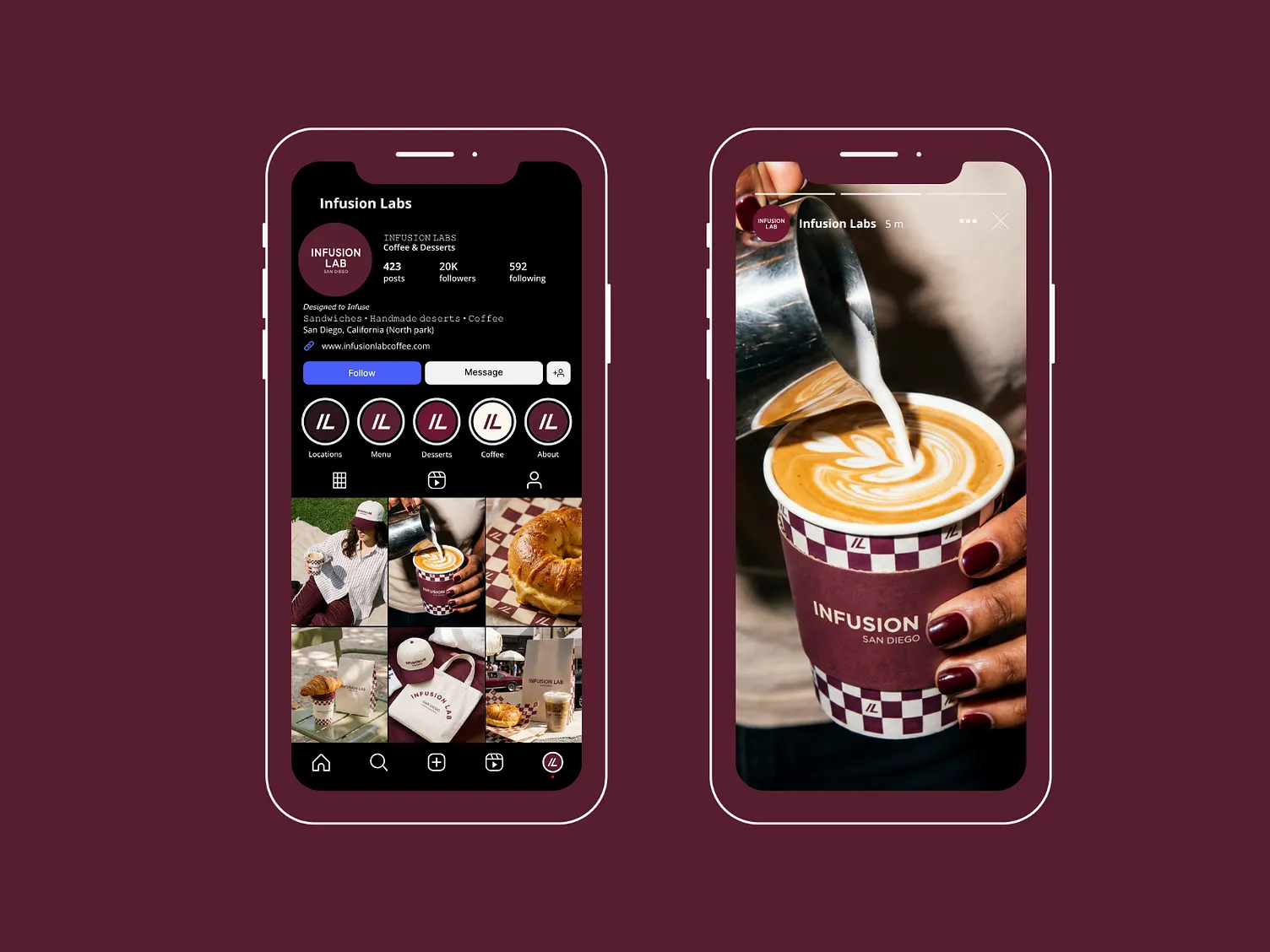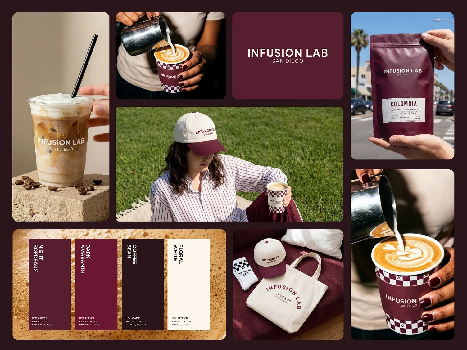Infusion Lab was created as a response to the traditional coffee shop aesthetic. Instead of leaning into rustic clichés, the goal was to build a brand that feels modern, minimal, and design-forward — yet still warm and approachable. Located in North Park, San Diego, the brand positions itself at the intersection of specialty coffee culture and contemporary urban design. The challenge was to create a visual identity that feels premium without becoming distant, and simple without feeling generic.